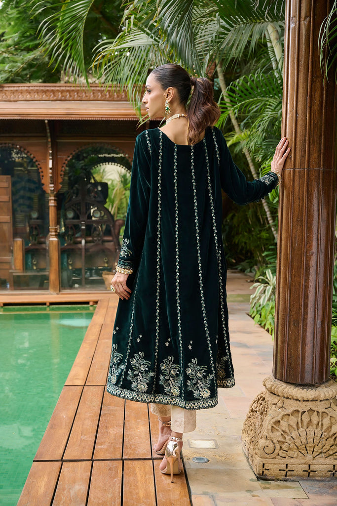 A sleek frock style velvet outfit in rich green. Delicate embroidered details at sleeves, hemline and on the length of the shirt. Paired with gold jamawar straight pants and a maissori, slightly crushed dupatta.